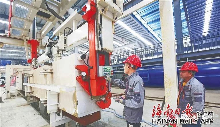 走进金牌港产业园首批引进的企业——康庄住工科技(海南)有限公司,办公大楼拔地而起,公司内外环境宜人,生产车间内机器声轰鸣,自动化设备有条不紊地运转。