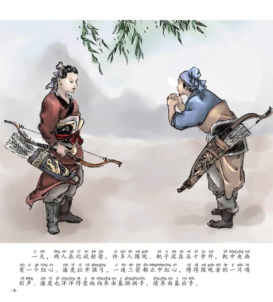 一天,两人在比试射箭,许多人围观。靶子设在五十步外,靶中央画有一个红心。潘虎拉开强弓,一连三箭都正中红心,博得围观者的一片喝彩声。潘虎也洋洋得意地向养由基拱拱手,请养由基出手。