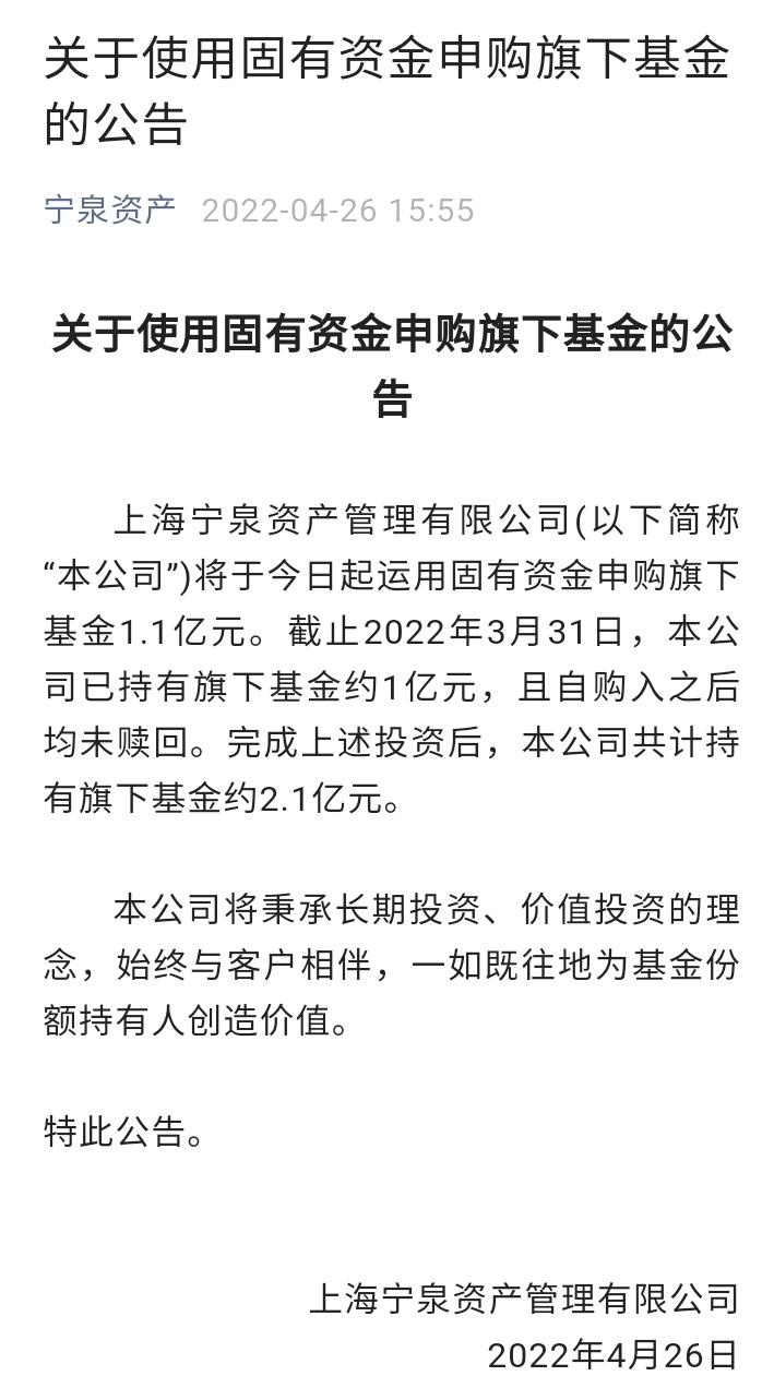 4月26日,知名股票私募宁泉资产在官微发布公告,称将于即日起运用固有资金申购旗下基金1.1亿元。众所周知,宁泉背后是原兴全基金总经理、资管大佬杨东,这位曾多次在高点提示风险的“良心基金经理”,此时选择自购,让大家对股市回稳多少重拾几分信心。