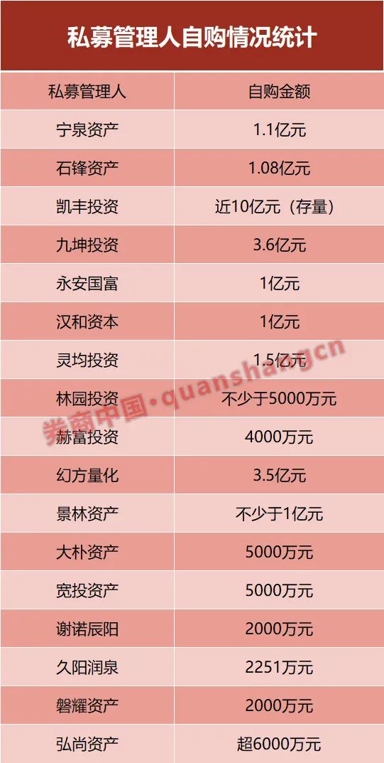 除宁泉外,石锋资产、凯丰投资、九坤投资、景林资产、汉和资本、永安国富、幻方量化、灵均投资的自购金额也均超过亿元。