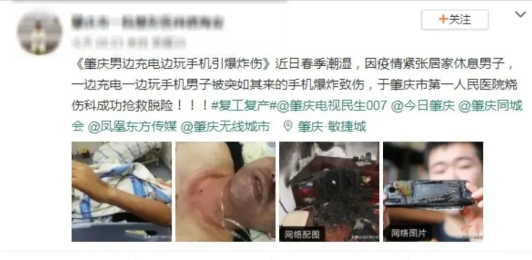 2020年3月,肇庆一男子在家边充电边玩手机,手机突然爆炸,造成患者面部、颈部、双上肢以及右下肢烧伤,面积达到15%左右。