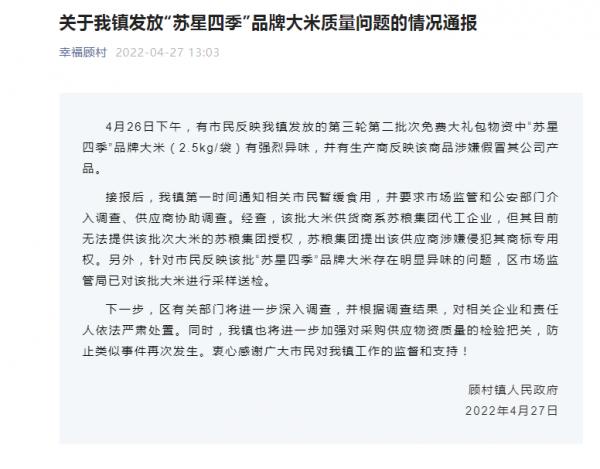 顾村镇官方微信公众号“幸福顾村”发布的通报称:4月26日下午,有市民反映顾村镇发放的第三轮第二批次免费大礼包物资中“苏星四季”品牌大米(2.5kg/袋)有强烈异味,并有生产商反映该商品涉嫌假冒其公司产品。