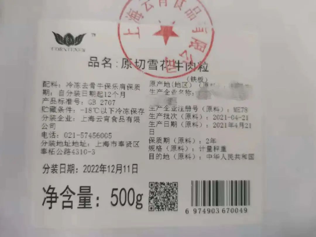 经查,该批牛肉系上海云宵食品有限公司生产销售。市场监管执法人员调取了当事企业加工的该批次牛肉的原料信息为:生产日期(原料)为2021年9月23日,保质期为2年,以及核验相关进口冷链检验检疫合格证明、核酸检测证明、消毒证明和追溯证明。