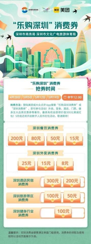 深圳市商务局、文化广电旅游体育局通过美团平台推出美食和文体旅游消费券,4月28日中午12点开抢。