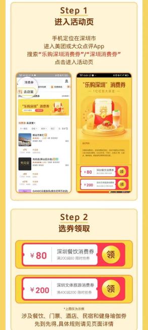 如何领取:当前地理位置定位在深圳市的用户登录美团或大众点评APP,首页搜索“乐购深圳消费券”或“深圳消费券”进入活动页即可领取。