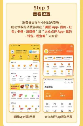 如何查看:消费券将在半小时内到账,成功领取的消费券请在“美团APP-我的-红包/卡券-消费券”或“大众点评APP-我的-钱包-现金券”内查看。