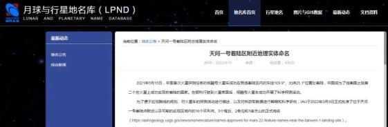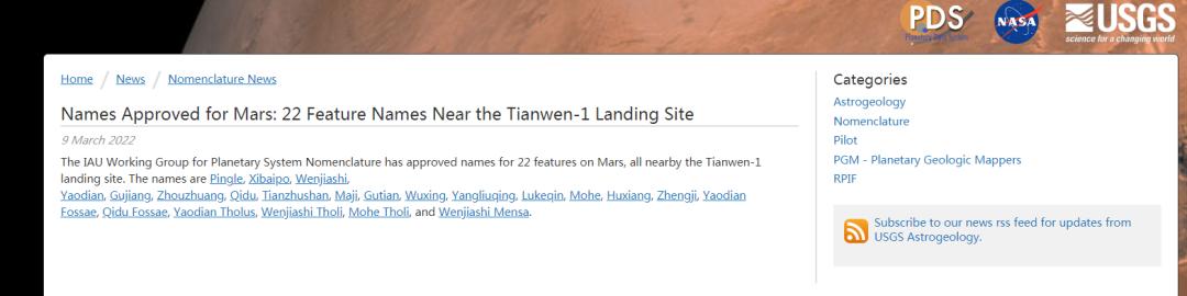 为了便于巡视路线的规划、对火星车的探测活动进行描述,以及对所获取数据进行解释和科学研究,IAU于2022年3月9日正式批准了位于天问一号着陆点附近以及可能的巡视区域内的16个环形坑、3个穹丘、2条沟和1座方山的正式地名。
