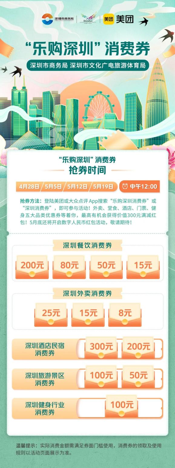 据悉,除了消费券,深圳还将于5月底组织多家银行,联合美团面向深圳消费者发放3000万元数字人民币红包,进一步丰富线上线下多元消费场景,为市民送上诚意满满的“大礼包”。