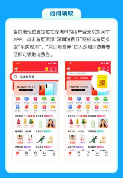 当前地理位置定位在深圳市的用户登录京东APP,点击首页顶部“深圳消费券”图标或首页搜索“乐购深圳”、“深圳消费券”进入深圳消费券专区即可领取。