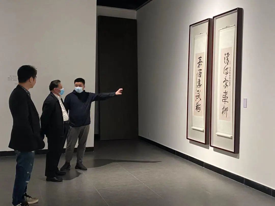 策展人匡正陪同鄢福初主席、谭国斌馆长观看练霄鹤书法展