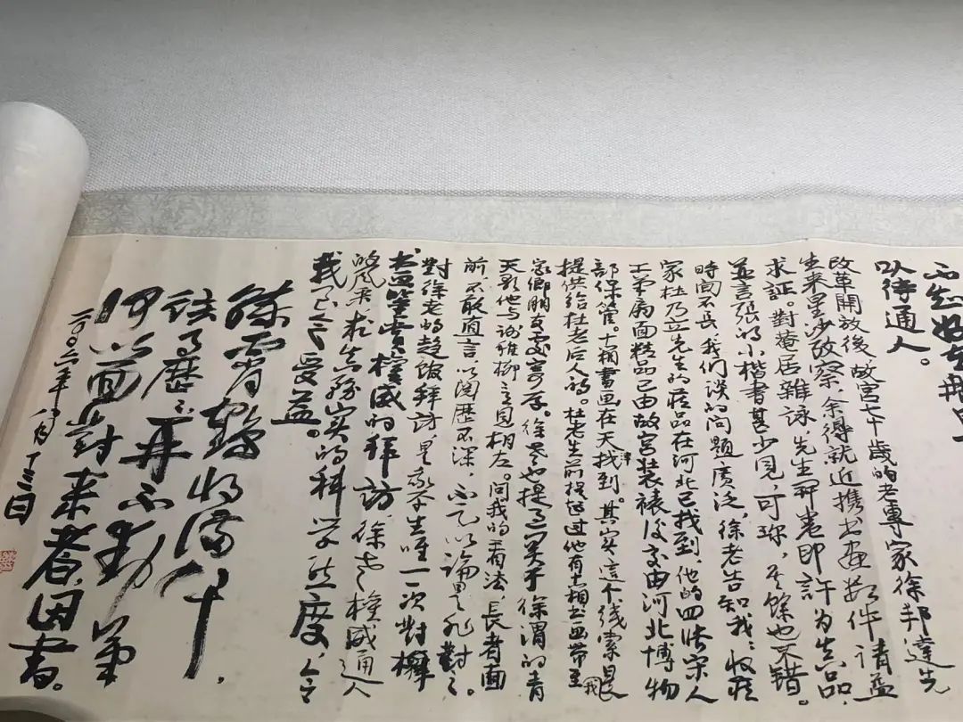 匡正在导览中说到:“作为明代的一代大家,张瑞图本身跟湖南的交集似乎不多。他的作品虽说并不太难见到,但是因为见得少,尤其在湖南,当时很多书家对他的真迹并不太熟悉。练老得到这个手卷后,很多前辈都表示怀疑,但是练老仍不以寻常视之。后来徐邦达先生来湖南鉴定馆藏书画,练老持卷请教,徐先生开卷即许为真品。”于此可见练老的慧眼。