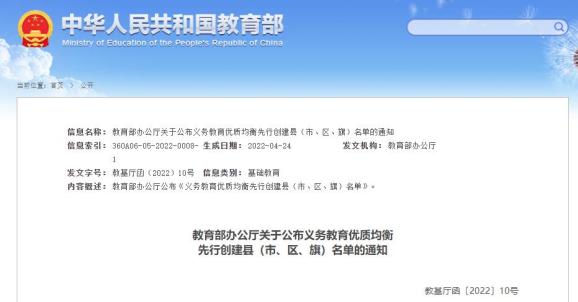 按照《教育部办公厅关于开展县域义务教育优质均衡创建工作的通知》(教基厅函〔2021〕43号)要求,在各省级教育行政部门遴选推荐的基础上,教育部确定了北京市东城区等135个义务教育优质均衡先行创建县(市、区、旗),现予公布。