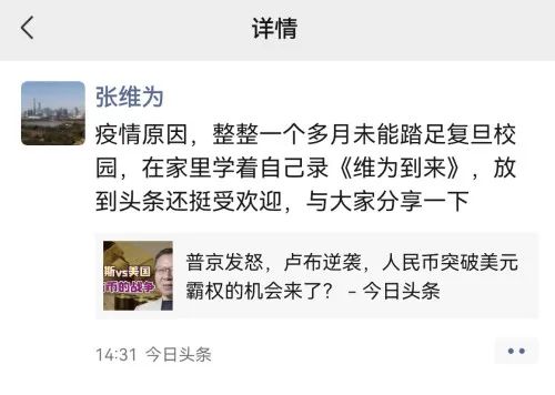 但就是这几条无稽之谈的谣言,最后演变到复旦校方亲自辟谣,党媒解放日报出面采访,以一篇《安静的复旦,“喧嚣”的复旦》向公众解释。张维为老师也发了朋友圈“报平安”。