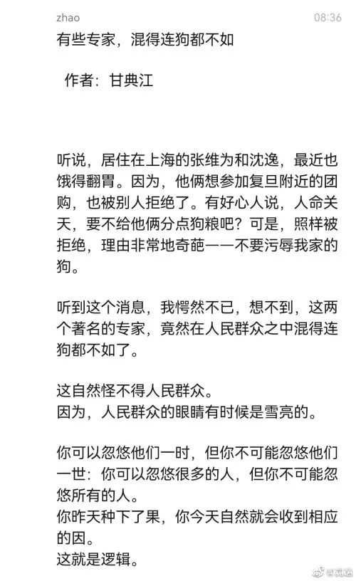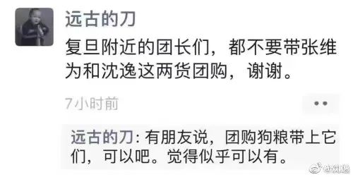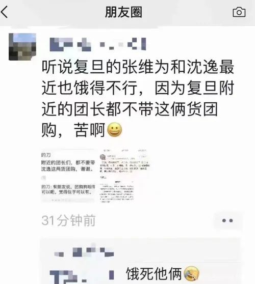 1. 沈逸(有些谣言在出场人物中也加上了张维为)想加复旦周围的团购群买吃的,被团长们踢出了团购,现在正在饿肚子。