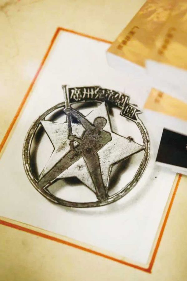 1937年7月7日,卢沟桥的炮声打响,民族进入危亡的紧急关头。在全国人民一致奋起抗日的时候,当年的9月18日,在广州,由中国共产党组织的一支儿童抗日宣传队伍——广州儿童剧团正式成立。1937年儿童剧团成立时,就有了属于自己的独特徽章。广州儿童剧团团徽由一颗五角星、一位高举“广州儿童剧团”团旗的人物及一个圆形图案组成。它的内涵是要大家万众一心、团结一致在党的指引下,为中华民族的解放努力奋斗。据当年广州儿童剧团的成员、如今已年过九旬的杨永洪爷爷回忆道:“当他们从戴团徽那一刻开始,便在心中立下盟誓,长大了要当一名伟大的共产主义战士。”
