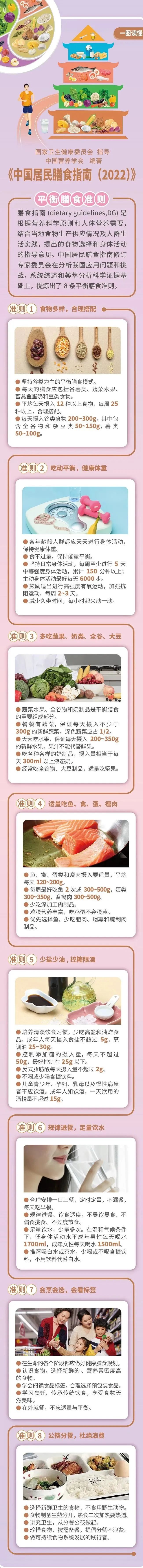 《中国居民膳食指南(2022)》提炼出了平衡膳食八准则:一、食物多样,合理搭配;二、吃动平衡,健康体重;三、多吃蔬果、奶类、全谷、大豆;四、适量吃鱼、禽、蛋、瘦肉;五、少盐少油,控糖限酒;六、规律进餐,足量饮水;七、会烹会选,会看标签;八、公筷分餐,杜绝浪费。