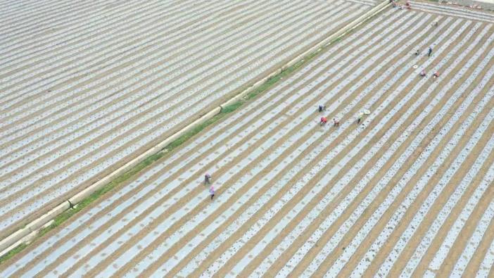 在柳州市鱼峰区白沙镇王眉村柳州螺蛳粉原料产业基地,村民在种植辣椒(无人机照片,3月16日摄)。新华社记者 黄孝邦 摄