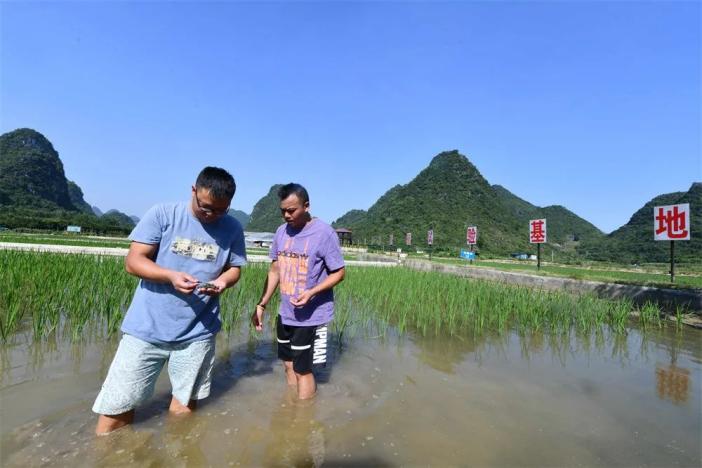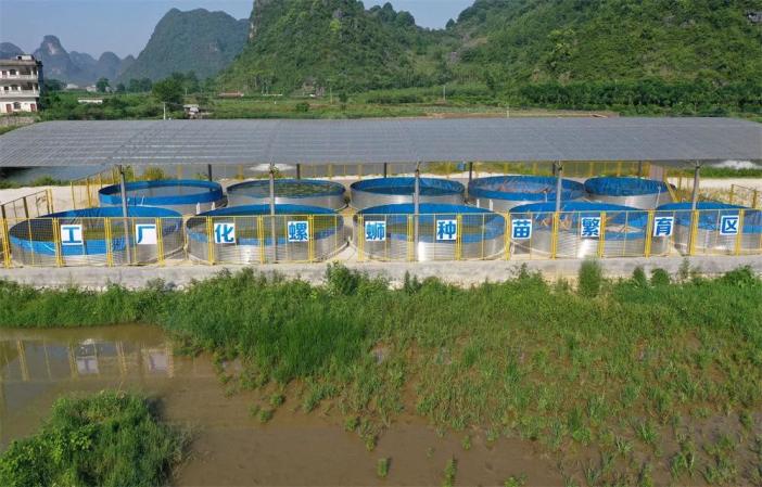 在柳州市柳江区里高镇板六村螺蛳养殖基地,技术人员在查看螺蛳生长情况(2021年6月6日摄)。新华社记者 黄孝邦 摄