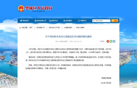 4月28日,襄阳市樊城区教育局发布关于新未来幼儿园食品安全问题的情况通报称,4月27日接到投诉后,樊城区委区政府责成相关部门立即成立工作专班开展调查,第一时间将相关食品进行封存,并送第三方机构检测,同时依法对汉水华城新未来幼儿园和衡庄新未来幼儿园食堂予以停业整顿处理。