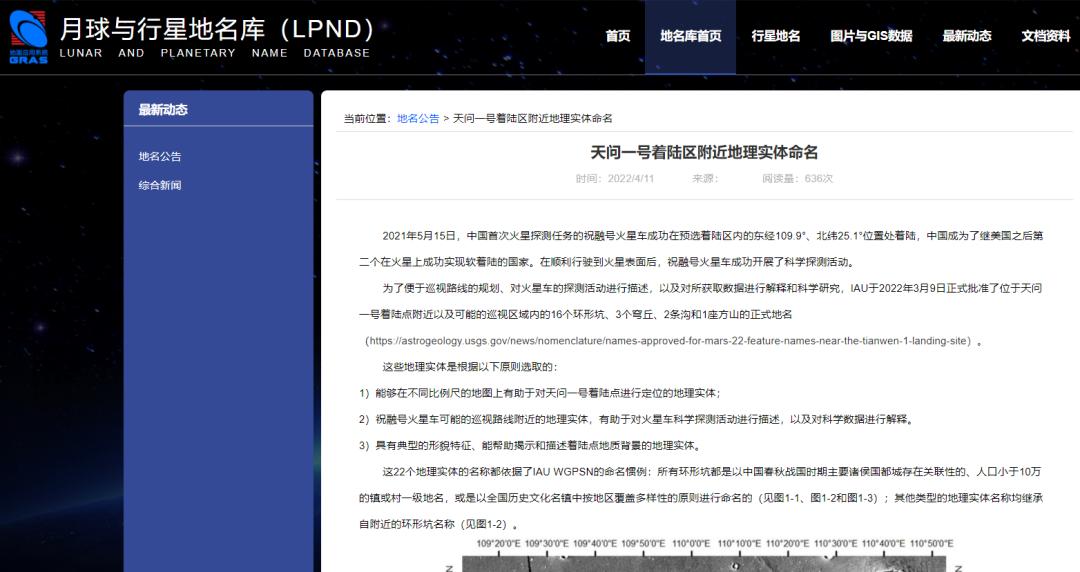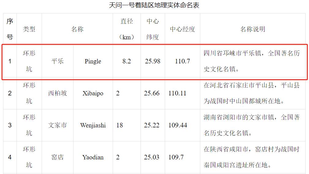 4月11日,根据我国月球与行星地名库(LPND)发布的公告,国际天文联合会 IAU于2022 年3月9日正式批准了位于天问一号着陆点附近以及可能的巡视区域内的16个环形坑、3个穹丘、2条沟和1座方山的正式地名,其中有一个地方被命名为“平乐”。