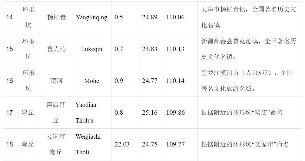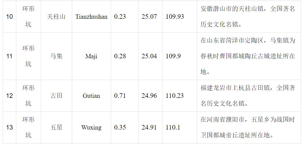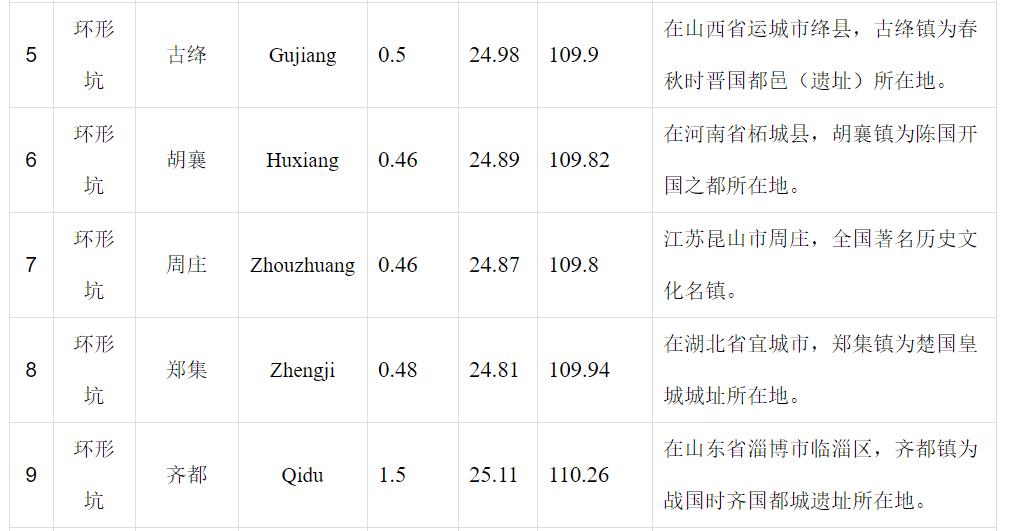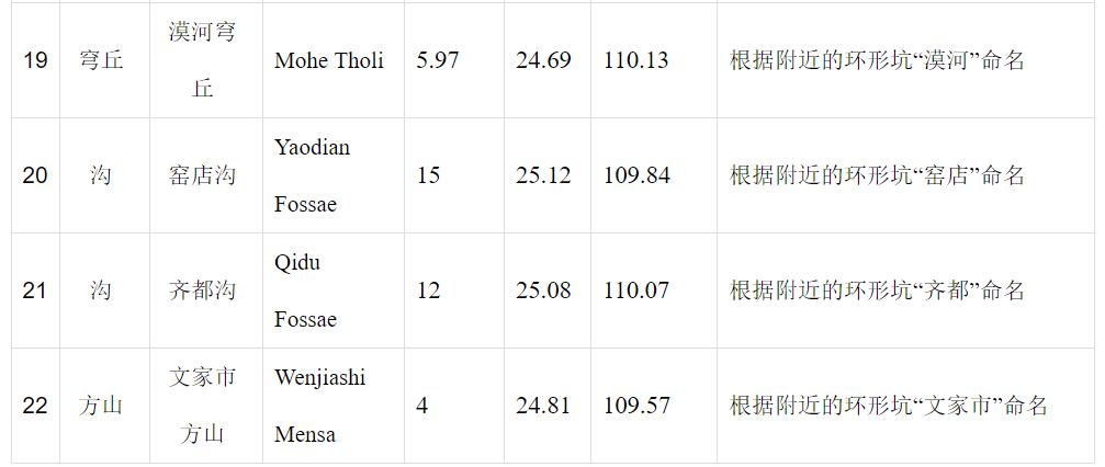 公告称,这22个地理实体的名称都依据了IAU WGPSN的命名惯例:所有环形坑都是以中国春秋战国时期主要诸侯国都城存在关联性的、人口小于10万的镇或村一级地名,或是以全国历史文化名镇中按地区覆盖多样性的原则进行命名的;其他类型的地理实体名称均继承自附近的环形坑名称 。