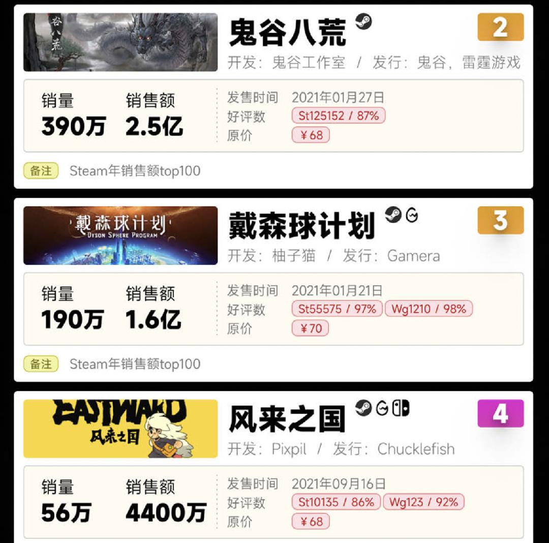 根据百度国游销量吧集合多方力量发布的2021年《国游销量年榜》,《鬼谷八荒》高居第二,销量达390万套,销售额约2.5亿,仅次于网易旗下的多人竞技大作《永劫无间》。