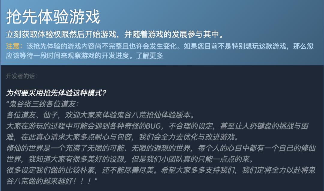 对玩家来说,这就是纯粹的欺骗行为。更何况,《鬼谷八荒》本身就有着极大的特殊性,它实际上还处在EA测试状态,这就让问题的性质变得更为恶劣。