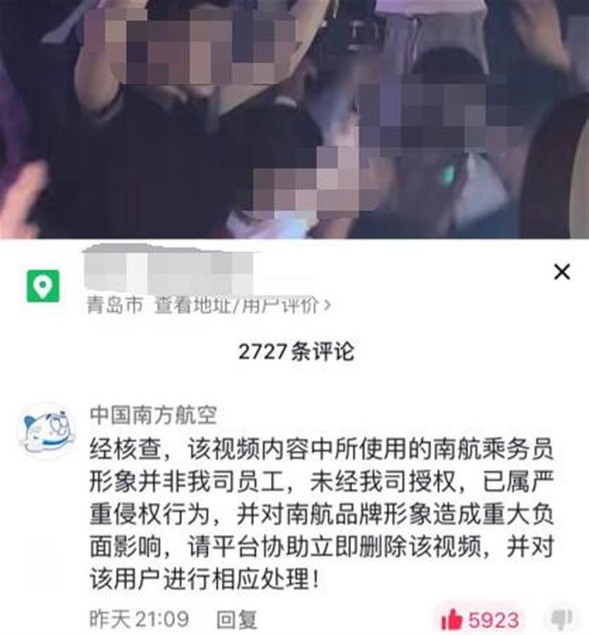 中国南方航空官方账号在该视频评论称:经核查,该视频内容中所使用的南航乘务员形象并非我司员工,未经我司授权,已属严重侵权行为,并对南航品牌形象造成重大负面影响,请平台协助立即删除该视频,并对该用户进行相应处理!