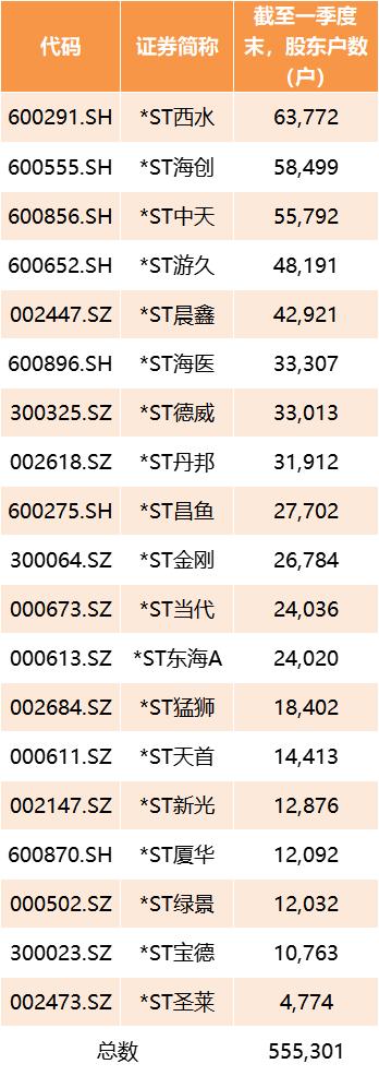 股东户数方面,截至今年一季度末,前述19家公司共有股东数55.53万户,其中,*ST西水、*ST海创、*ST中天等3家公司股东户数超过5万。