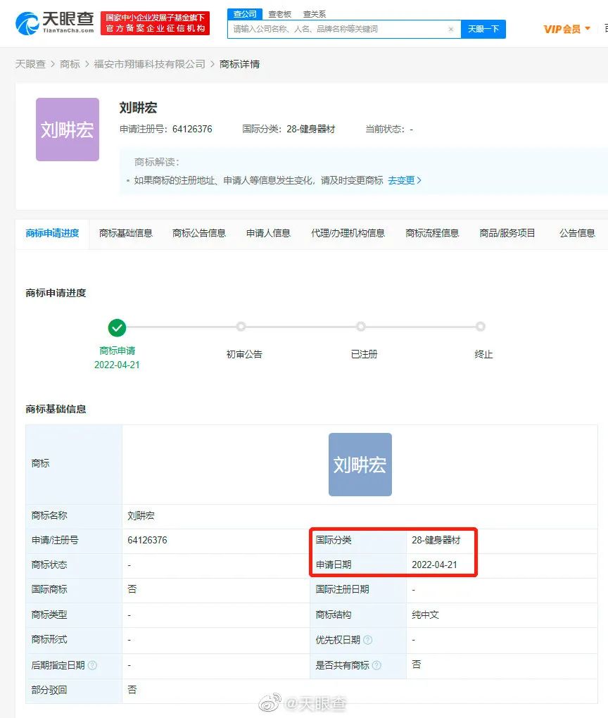 据媒体报道,早在4月21日,也就是刘畊宏刚火没多久,就有人“洞察先机”,向国家知识产权局提交了申请,注册“刘畊宏”这三个字的商标,国际分类为28类:娱乐品,玩具,体育及运动用品,圣诞树用装饰品。