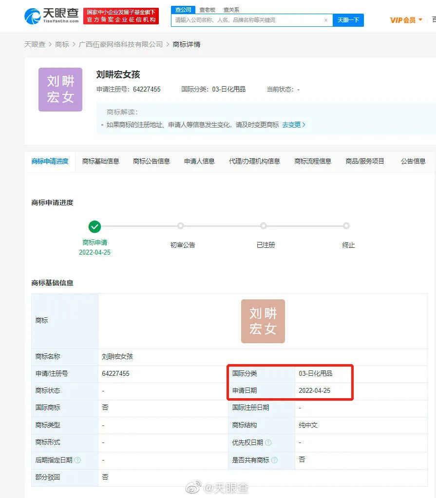 值得一提的是,“刘畊宏女孩”也被广西一公司申请注册,国际分类为日化用品。