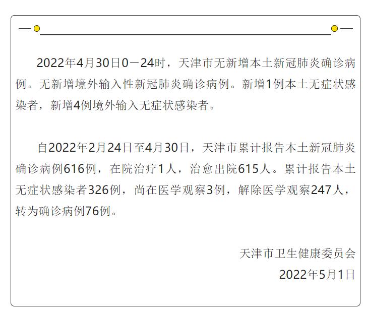 2022年4月30日0-24时,天津市无新增本土新冠肺炎确诊病例。无新增境外输入性新冠肺炎确诊病例。新增1例本土无症状感染者,新增4例境外输入无症状感染者。