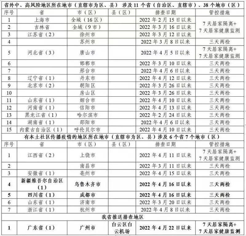 值得注意的是,广东疾控公布的表格中还特别提出一处“我省推送排查地区”——“广州市白云区白云机场”,排查日期为“2022年4月22日以来”,管控措施一栏表述为“7天居家隔离+7天居家健康监测”。