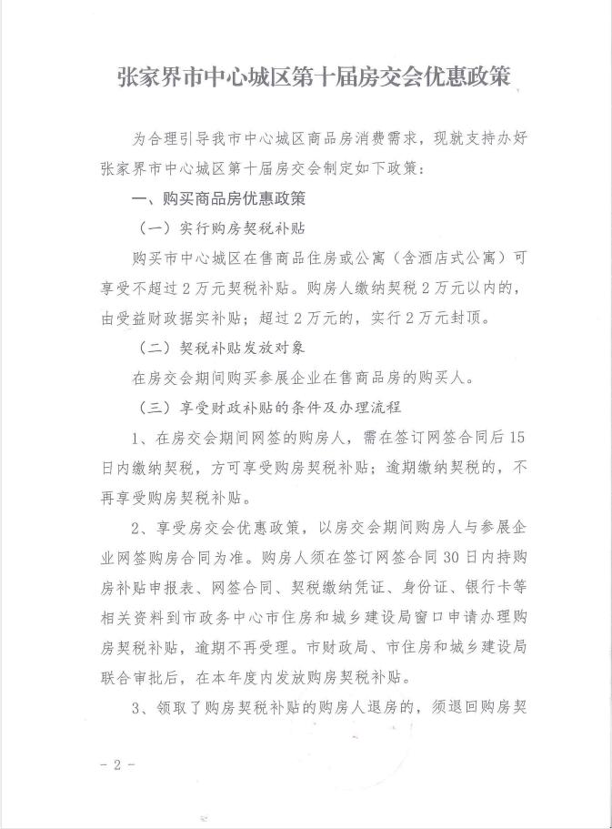 为满足更多人置业安家,促进房地产行业健康发展,张家界第十届房交会推出三项优惠政策:一是政府推出购房契税补贴,二是首付降低、车位可以按揭,三是房企推出购房、购车位优惠政策。