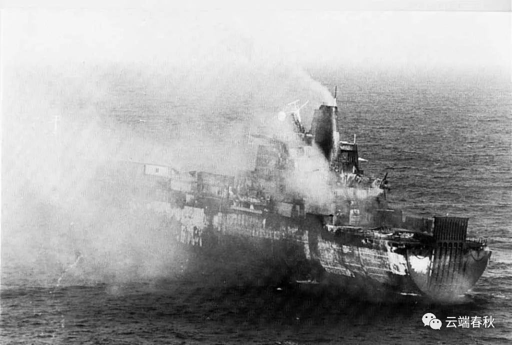 “大西洋运送者”也进行了机动,但是在没有雷达告警、干扰系统和防空系统的条件下,如此巨大的商船想凭借机动能力摆脱“飞鱼”几乎枉然。两枚“飞鱼”先后命中了左舷,导弹的爆炸引发甲板下方大量航空油料和弹药物资的爆炸,大火熊熊腾起无法控制。当时驾驶“海王”直升机的安德鲁王子后来回忆说,“爆炸飞散的碎片在400米半径内溅起无数水花”。