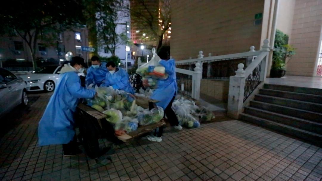 4月2日晚上9点,一批蔬菜从南京远道而来,蔬菜的保鲜期容不得片刻耽搁,和泰花园的兵支书李宝嘉便火速召集了十几名居委干部、社工和志愿者前来帮忙。虽然已近半夜,但大家没有丝毫犹豫,二话不说就“披挂上阵”,先清点数量,然后挨家挨户送“蔬”上门。深更半夜,居委会灯火通明,“蔬菜包”从小区大门到楼栋口,再到电梯口,再到居民家门口,运“蔬”小分队干得是如火如荼。凌晨4点,843份蔬菜礼包全部发放完毕。