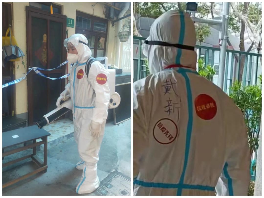 来自海园居民区的退役军人戴新每天都会背上50斤的消杀设备,对辖区内公共区域开展消杀。在这块由华山路、常熟路、长乐路和乌鲁木齐中路“圈起”的居民小区里共有168栋楼,每天七点起,戴新就要和另外一位专业的消杀队员开始一天的消杀之旅。设备运转时的轰鸣声不绝于耳,喷射出的雾化消毒水模糊了视线,人在闷热的大白服里好像在蒸桑拿,他们就这样走过一幢幢封控楼栋,或是徒步爬上每一层楼,一干就是数小时,多的时候一天要走三万多步。