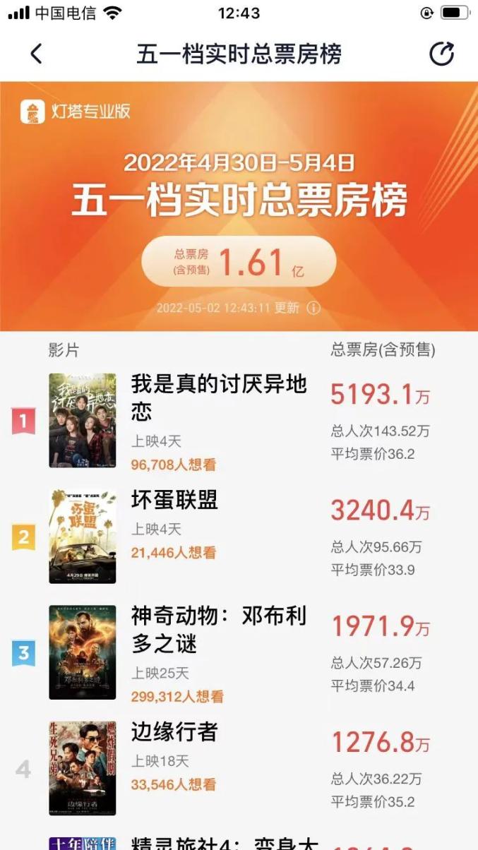 截至5月2日12时,“五一档”总票房(含预售)突破1.6亿元。当前档期票房前三影片分别为:《我是真的讨厌异地恋》5197万,《坏蛋联盟》3240万以及《神奇动物:邓布利多之谜》1971万。前两部为“五一档”新上映的电影,《神奇动物:邓布利多之谜》为4月8日就已上映的电影。
