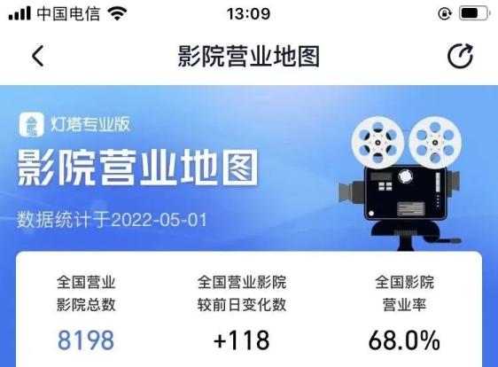 从今年“清明档”开始,全国影院营业率一直维持在50%左右,“清明档”以1.20亿元的总票房创下了近十年来(除2020年)“清明档”票房最低值。不过,近日的全国影院营业率已在缓慢上升。据灯塔专业版影院营业地图显示,截至5月1日,全国营业影院总数8198家,全国影院营业率68%,单日增加118家。