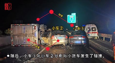 随后,后方2辆小车分别撞上侧翻的小货车,事故造成粤G***U1号小车的驾驶人及乘客受伤,2人经送医院抢救无效死亡。