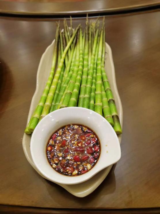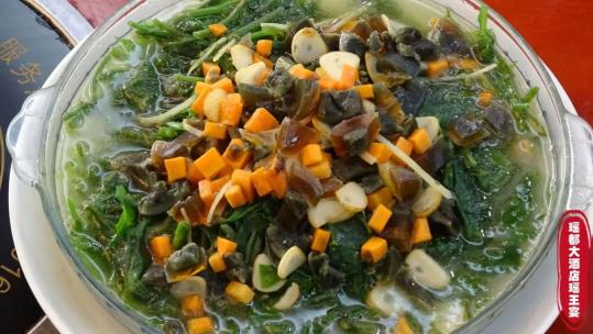 上汤石崖菜,石崖菜是金秀当地特有的野菜,用石崖菜和皮蛋、红萝卜煮成上汤石崖菜汤,口感甘甜,回味无穷。