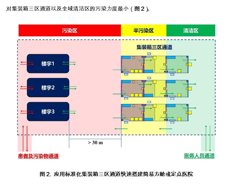 建方舱最关键的一个问题就是如何设立符合感控规范的“三区两通道”。“三区”包括:污染区、半污染区和清洁区,“两通道“包括医务人员通道,以及患者与污染物通道。如果按照现有规范来从零建造”三区两通道“,建设周期会很长,势必会影响感染者的快速隔离收治与传染源的控制。