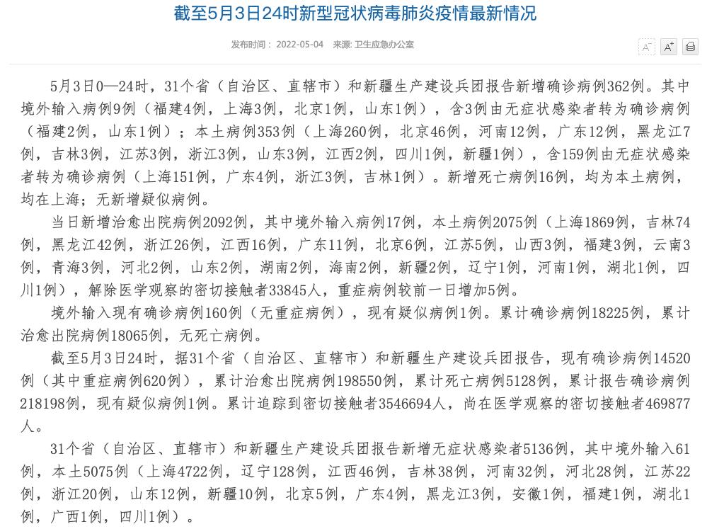截至5月3日24时,据31个省(自治区、直辖市)和新疆生产建设兵团报告,现有确诊病例14520例(其中重症病例620例),累计治愈出院病例198550例,累计死亡病例5128例,累计报告确诊病例218198例,现有疑似病例1例。累计追踪到密切接触者3546694人,尚在医学观察的密切接触者469877人。