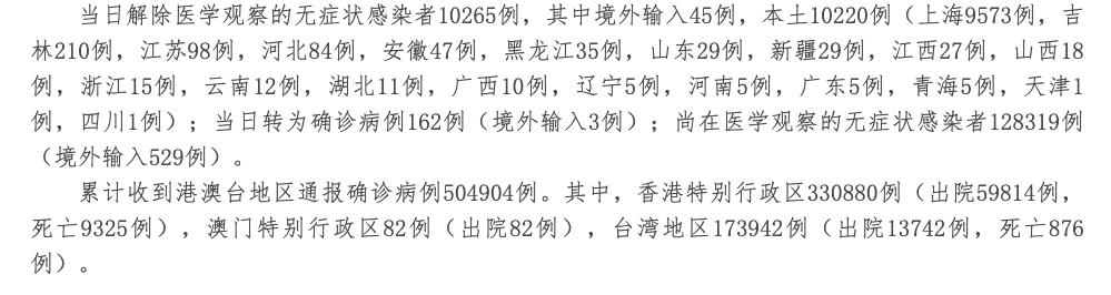 当日解除医学观察的无症状感染者10265例,其中境外输入45例,本土10220例(上海9573例,吉林210例,江苏98例,河北84例,安徽47例,黑龙江35例,山东29例,新疆29例,江西27例,山西18例,浙江15例,云南12例,湖北11例,广西10例,辽宁5例,河南5例,广东5例,青海5例,天津1例,四川1例);当日转为确诊病例162例(境外输入3例);尚在医学观察的无症状感染者128319例(境外输入529例)。