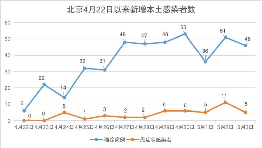5月3日0时至24时,北京新增46例本土确诊病例(确诊病例1、2昨日已通报)和5例无症状感染者,无新增疑似病例;新增1例境外输入确诊病例,无新增疑似病例和无症状感染者。治愈出院8例。