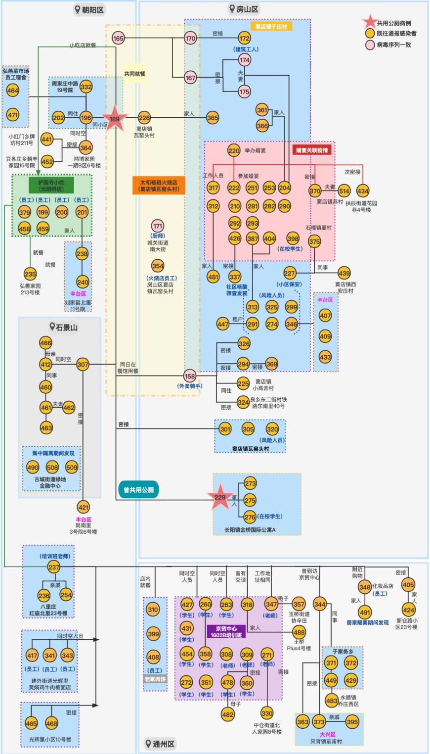 一是房山区窦店镇瓦窑头村太和褡裢火烧店相关疫情,因感染者到该店就餐,传染同餐人员及该店工作人员,同餐人员进一步扩散至参与婚宴的人员,截至目前,已累计发现感染者超70例。