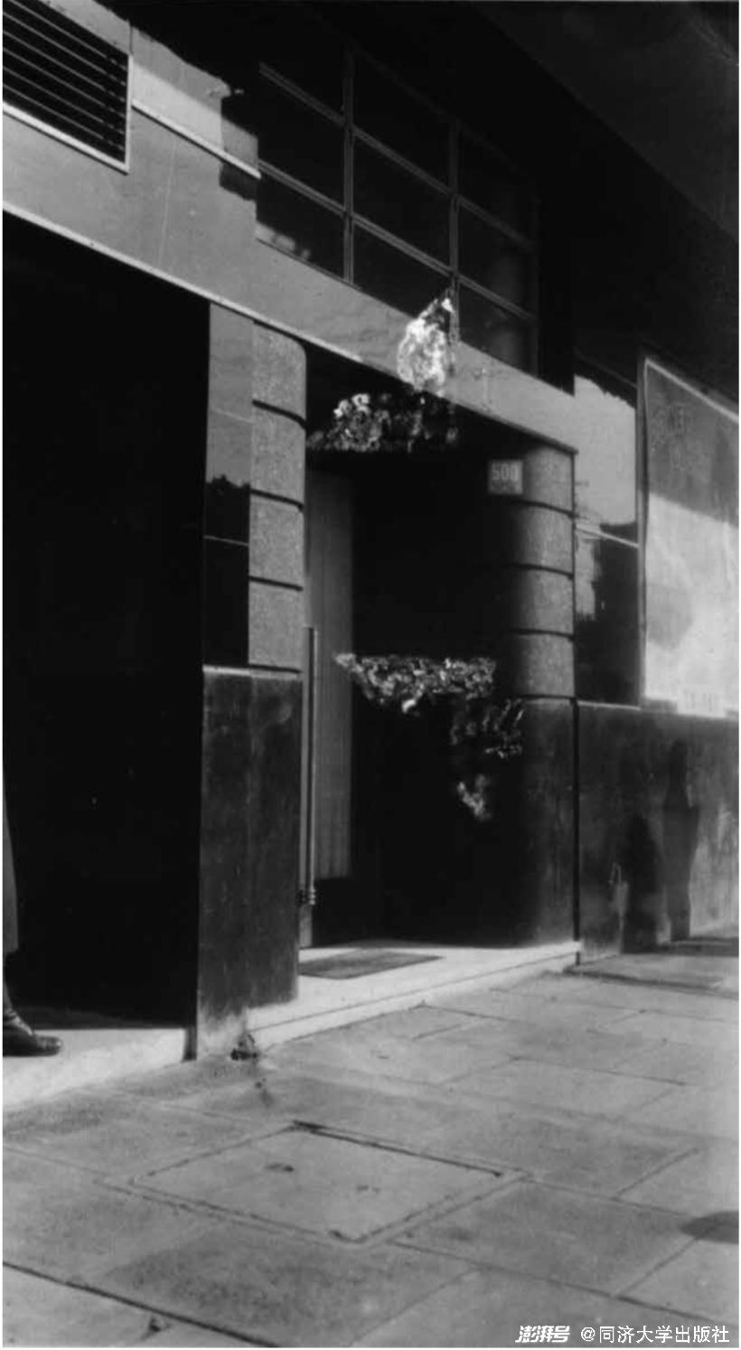 从当年的蜡笔夜景渲染图来看,在立面上华盖所突出的正是他们精心设计的8根霓虹灯柱——为玻璃砖柱内贯穿浅蓝色霓虹灯管,玻璃砖断面呈“凹”形。以玻璃砖柱作立面,实际上是极大地简化了立面的装饰,又获得了视觉上的娱乐效果,所以并不显得简陋。而作为背景的下一个层次的窗户和窗槛墙,华盖就处理得极其简单,二楼及以上墙面只做斩假石(pre-cast artificial stone polished),在窗和玻璃砖柱之间的墙面上拉出两组横纹,窗也只选金属细框。