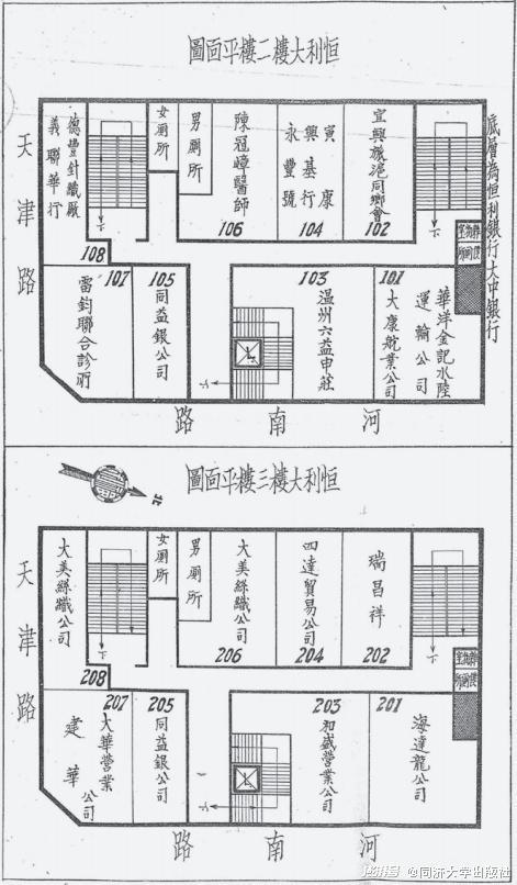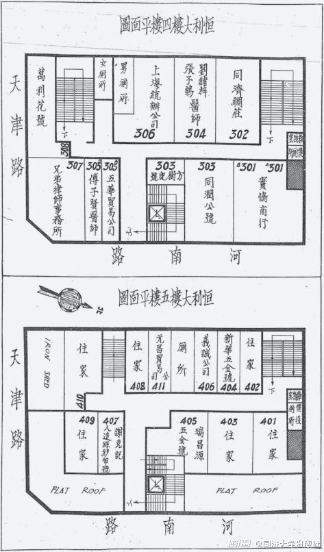 楼上出租写字间给多家公司办公,与一楼北侧的银行办公完全分离。它们在东面即沿街面建筑首层的正中位置共享一个交通门厅,名为“恒利大楼”,采用环绕电梯的三跑楼梯模式,在建筑西北角的楼梯也仅为楼上所共享。其平面选用了中间通道、两边房间的模式,有律所、诊所、绸庄、同乡会、贸易公司等各色商户,五楼则是更小的办公单元,东向5个房间享有露台,实际使用时有4户为住家,另一户为纱布号,内部为五金号、贸易公司,还有两户住家。南侧银行营业区的楼梯也通往楼上,达到最大效率。保管库的设计也较独特:“银库设于该屋之第一层,盖为避免沪上巨水为患,水浸地窖殃及金库之虞。保管库采用新通公司承办最新式之保管箱及库门,设置于夹楼北隅,由底层仰首在望,顾客租用,极感便利。”