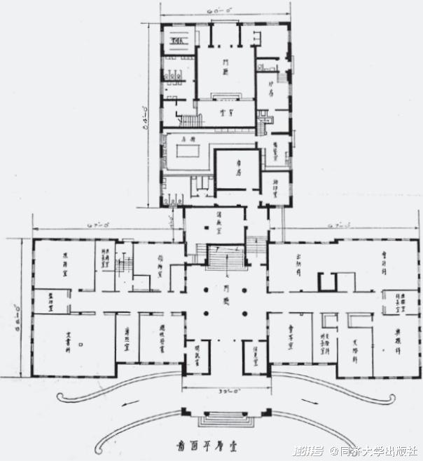 华盖首先改动了总体平面,将原独立的两个工程整合起来。原设计中两栋建筑主要立面均朝西,各自朝向中山路开门,最终方案则从中山路引入辅路,设置环岛,两栋建筑均朝向环岛,主要立面调整为南北。华盖设计的平面也呈T字形,基泰工程司的方案平面布局成为华盖设计的依据,只是根据调整的任务书做出稍许改动。办公大楼整幢建筑通面阔51米,通进深55米,面积约5050平方米,原方案通面阔约67米,通进深约48米。整个中轴序列上的内部空间与外部体量都缩小了,故而形态上呈现出的是前部建筑由凸出改为凹进,后部建筑由横向改为纵向。The China Reconstruction & Engineering Review(《新中国建设月刊》)1934年7月刊登的介绍文章称,这种平面是为了方便图书馆和花园二期施工,文章刊发时一期主体已经完成。