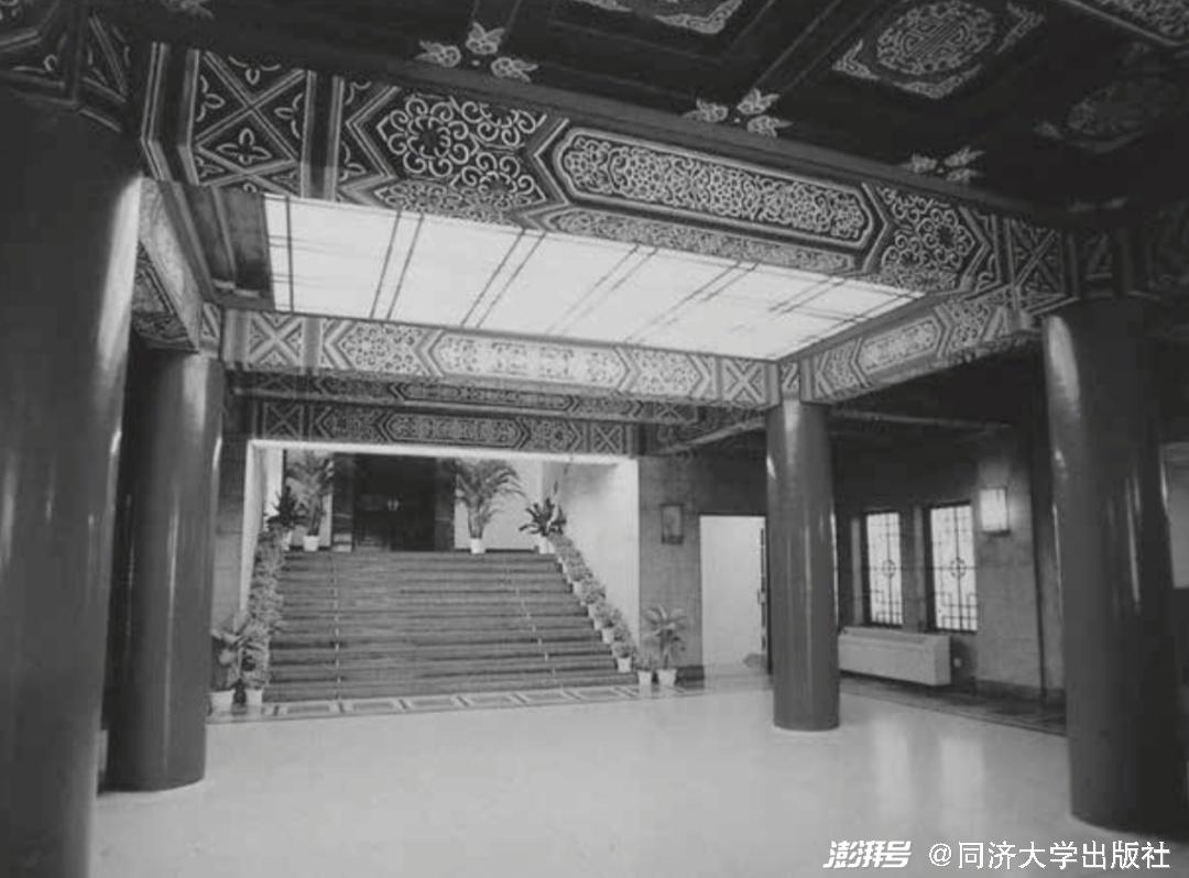 室内外风格大异,室内以借鉴中国传统建筑室内装饰手法为主,这种做法在当时可能也颇为流行,如董大酉五角场自宅外部为现代式,内部天花仍用彩画。办公大楼主要结构构件如柱、梁、枋等均上施油漆或彩画,但结合了现代化的地面铺装,如大厅用淡红色水刷石,局部间或镶嵌黑色,室内走廊大面用浅绿色马赛克,四周用深绿色马赛克作为边框;顶部明装的日光灯和墙上方形的古铜色壁灯并置。